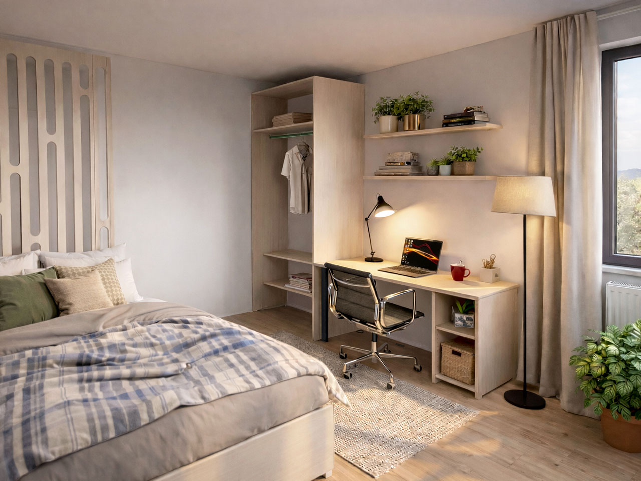 - Alle Zimmer erhalten eine wohnliche Grundausstattung, sodass Ihre Mitarbeiter keinen Aufwand oder Kosten für eigene Möbel haben